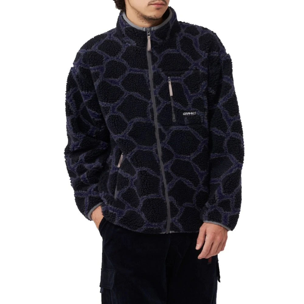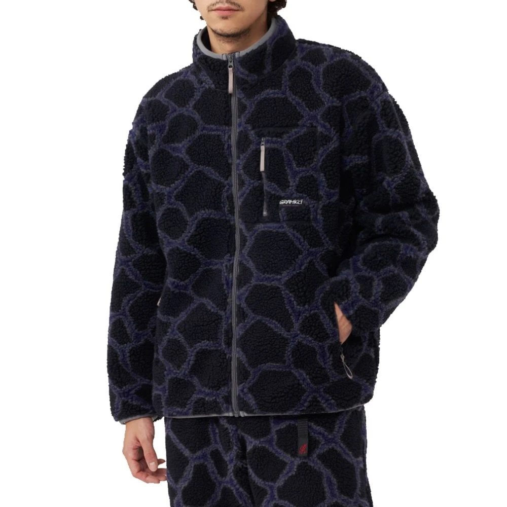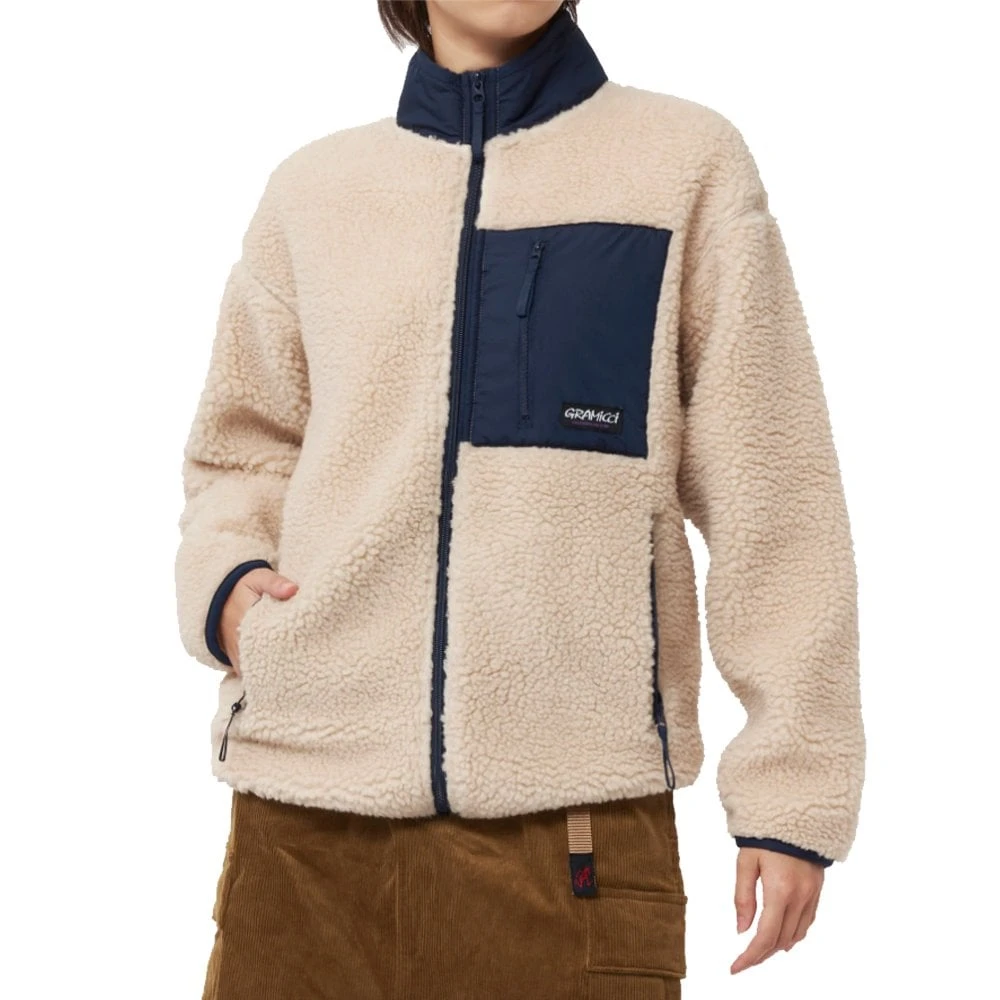The warm and fuzzy Gramicci Sherpa jacket made from a jacquard material with a collar, cuffs and hem that is designed to reduce wind penetration, making it perfect for cooler weather. The fleece also features three zippered pockets with mesh lining and a stand up collar and finished off with stretch binder tape around the collar edge, cuffs, and hem to reduce wind penetration