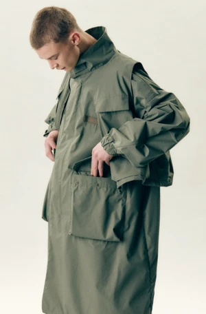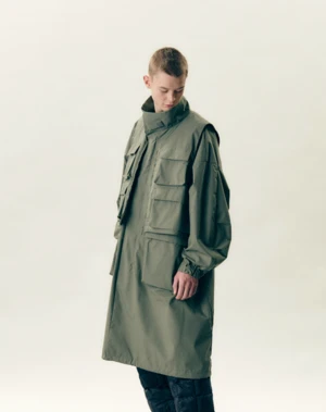 This Layered jacket is made using a functional material that is a blend of recycled polyester made from recycled plastic bottles and aramid fiber Kevlar, a high-strength anti-frame material. The high-performance punching insulation EVO with excellent breathability and warmth is used as the filling material.